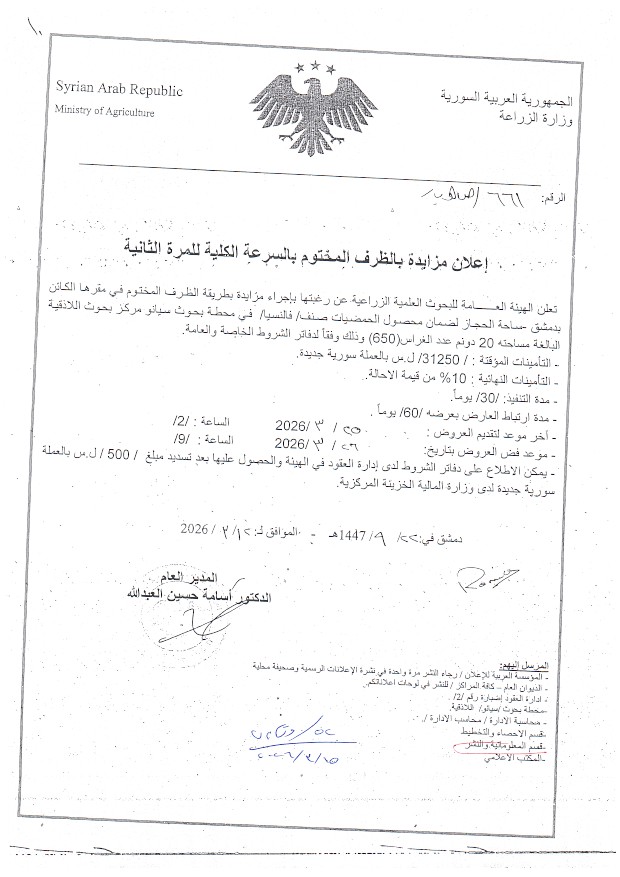 التدوينة السابقةاعلان مزايدة بالظرف المختوم بالسرعة الكلية لضمان محصول الحمضيات صنف فالنسيا في محطة بحوث سيانو/مركز بحوث اللاذقية